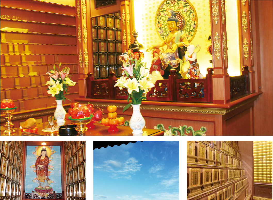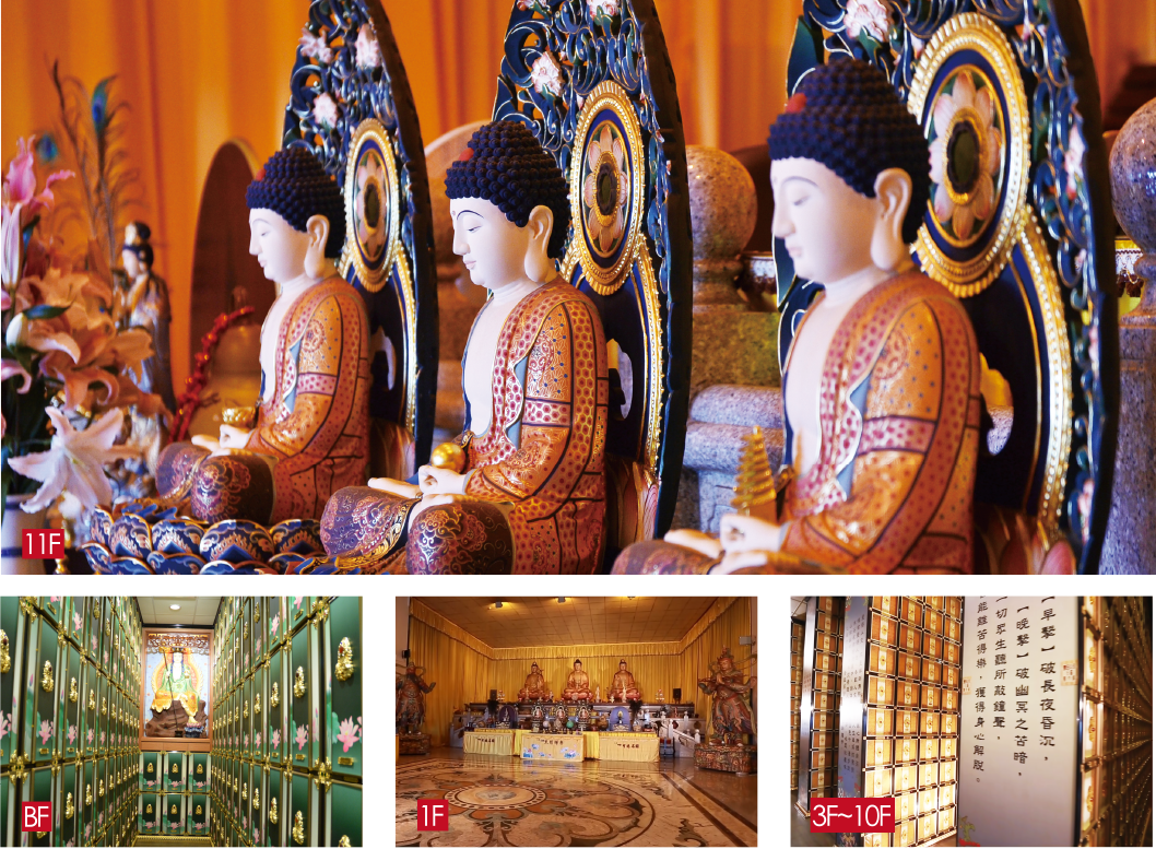 祭拜大廳(挑高二層),為西方三聖殿、萬佛牆、牌位以及管理接待中心。